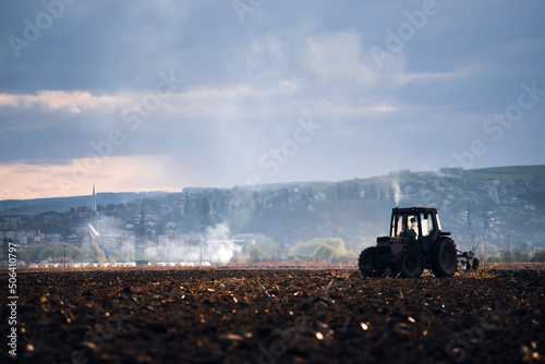 © erika8213, Fototapeta premium Tractors plowing fields in early spring