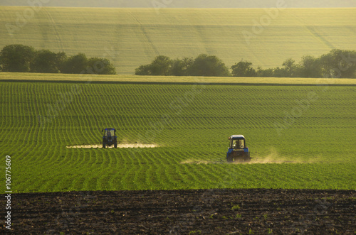 © izikmd, Naklejka premium Tractors sprayed cornfield