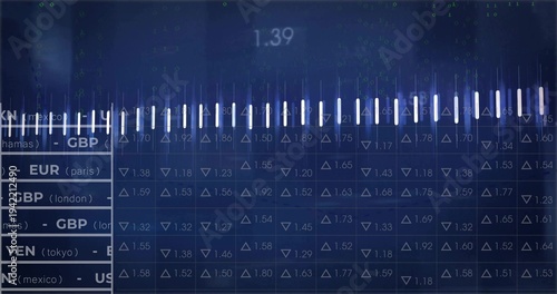 Fototapeta premium Trading dashboard showing dark blue grid with white bars, triangular icons, tickers, 1