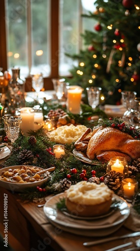 Naklejka premium Traditional American Christmas festive dinner with roasted turkey