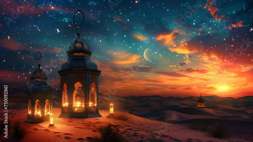 © Mizan Studio, Fototapeta premium Traditional Arabian lantern standing on the sands of a serene desert under the crescent moon, evoking Ramadan's spirituality and the tranquil beauty of an endless background