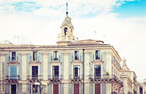 Fototapeta premium Traditional architecture of Sicily in Italy, typical street of Catania, facade of old buildings.