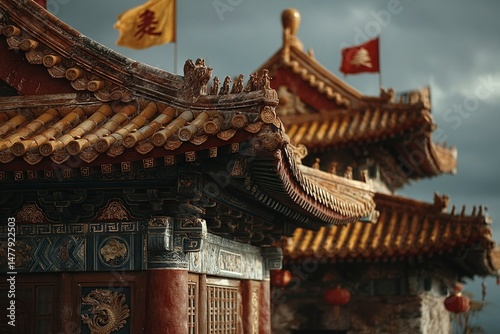 © Patria, Fototapeta premium Traditional Architecture with Intricate Roof Details and Cultural Flags