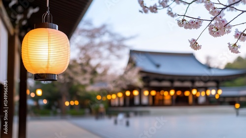 Obraz premium Traditional Asian temple with illuminated lanterns and blooming cherry...