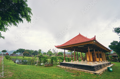© luengo_ua, Obraz premium Traditional balinese architecture. Tiled pavilions near the lake in the green park.