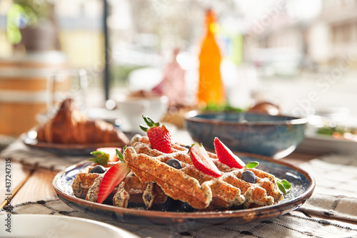 Fototapeta premium Traditional Belgian dessert - waffle with strawberry and cream.