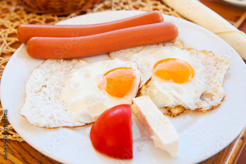 Fototapeta premium Traditional breakfast with fried eggs and sausages