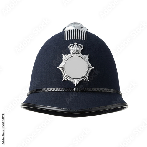 © Mikhail, Naklejka premium Traditional british bobby police custodian helmet with a silver crown badge and insignia