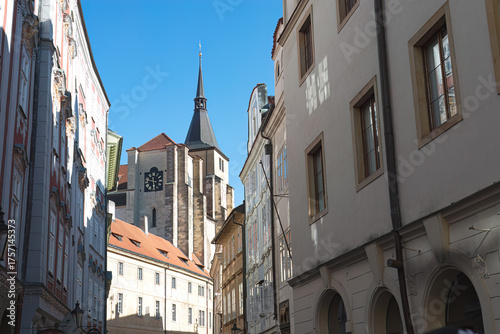 Fototapeta premium Traditional buildings lining a narrow street, with a church tower rising above them in Prague, Czech Republic