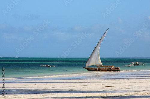 © dsukhov, Naklejka premium traditional central African fisherman sailboat on beach