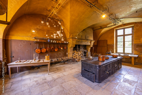 Naklejka premium Traditional Chateau de Commarin kitchen with historical iron stove