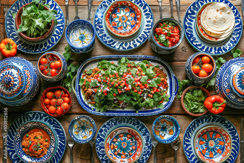 Fototapeta premium Traditional chiles en nogada surrounded by colorful talavera on rustic table setting