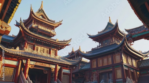 © SETSU 21, Fototapeta premium Traditional Chinese architecture with pagodas and ornate roofs. No people, clear blue sky.