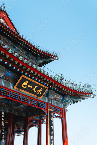 Fototapeta premium Traditional Chinese architecture with vibrant red pillars and intricate roof...