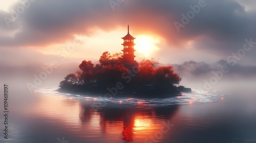 Fototapeta premium Traditional Chinese black and white flowing river and ancient pagoda...