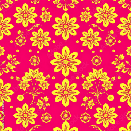 Obraz premium Traditional Chinese floral fabric with gold motifs on fuchsia background.