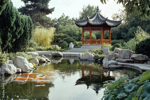 © Thanapong, Fototapeta premium Traditional chinese garden serenity tranquil landscape nature scene cultural heritage reflective pond lush environment peaceful viewpoint celebrating tradition in harmony
