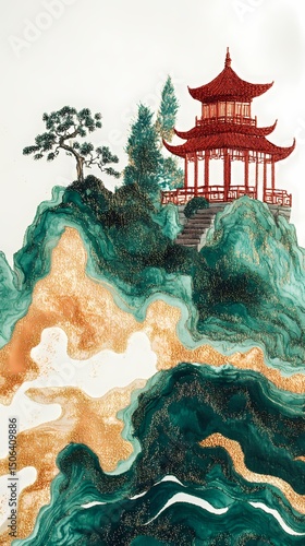 Fototapeta premium Traditional Chinese gold red green mountain pavilion illustration poster...