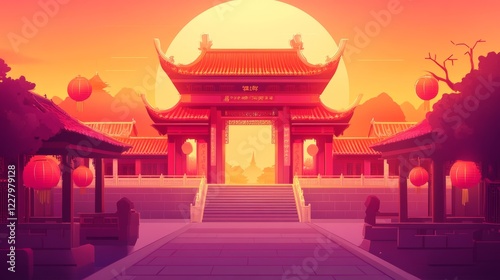 © ImageKing, Fototapeta premium Traditional Chinese house or temple door with roof, stairs and lanterns. Cartoon vector illustration set of oriental building arch gate. Asian pavilion antique entrance with classic decoration.