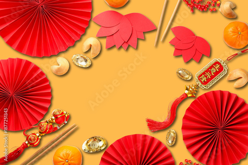 Obraz premium Traditional Chinese New Year elements on a bright backdrop