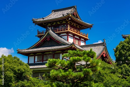 © Wirestock, Obraz premium Traditional Chinese pagoda against a bright blue sky with white fluffy clouds in the background