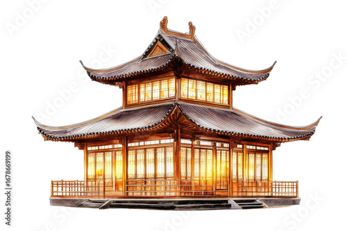 © mahatabuddin, Naklejka premium Traditional chinese pagoda architecture illuminated at night isolated on transparent background. Watercolor traditional asian pagoda with windows and intricate roof isolated on white background.