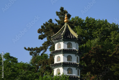 Fototapeta premium Traditional Chinese Pagoda in Lush Garden | Serenity & Cultural Heritage | a...