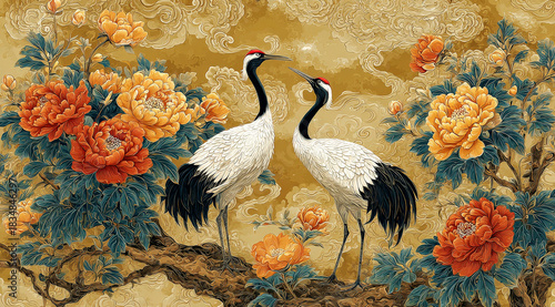 © fanjianhua, Obraz premium Traditional Chinese painting with cranes and peonies in a beautiful setting