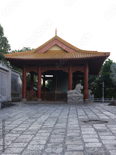 © Dong, Naklejka premium Traditional Chinese Pavilion with Stone Lion Statues in a Serene Courtyard Setting