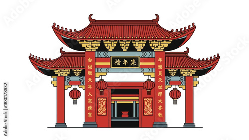 Fototapeta premium Traditional chinese temple gate with red lanterns and calligraphy