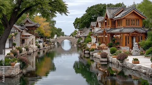 Obraz premium Traditional chinese water town architecture with curved stone bridge and classic wooden houses high resolution picture