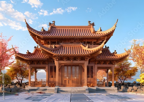 © Adobe Contributor, Fototapeta premium Traditional Chinese Wooden Pagoda Architecture with Autumn Foliage