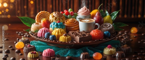 © AkuAku, Fototapeta premium Traditional coffee and treats displayed on a wooden surface.