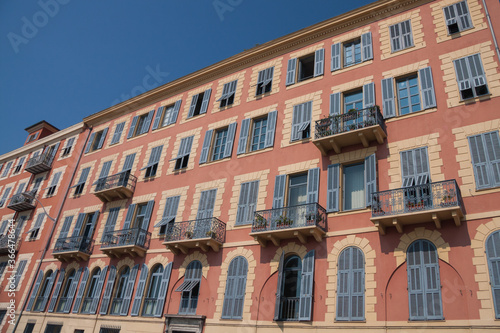 Fototapeta premium Traditional colorful painted building with blue shutters and balconies under a clear blue sky in Nice, France