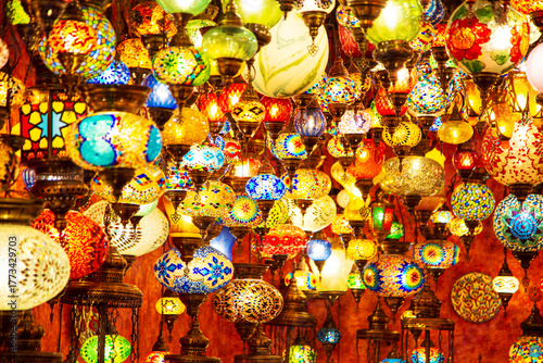 © lizavetta, Fototapeta premium Traditional colorful Turkish lamps at the Grand Bazaar. Stained glass mosaics.