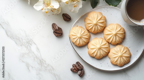 Fototapeta premium Traditional cookies served with a cup of coffee on a white marble background...