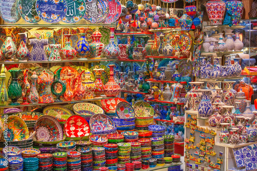 Naklejka premium Traditional decorated turkish souvenirs sold in Grand Bazaar in Istanbul, popular tourist attraction