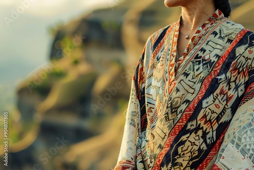 Fototapeta premium Traditional dress with intricate patterns, mountains in backgrou
