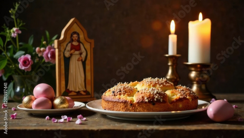 Fototapeta premium Traditional Easter setup: an icon, lit candles, and freshly baked cakes on a...