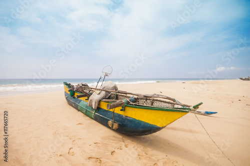 Fototapeta premium Traditional fishing boat on the beach. Shot in Sri Lanka.