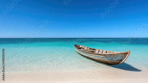 Naklejka premium Traditional fishing boat rests on serene beach, surrounded by clear turquoise...