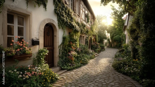 © Chotnarint blue, Naklejka premium Traditional french country lane with vibrant flowers and flag elements france nature scene serene atmosphere