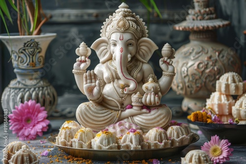 Fototapeta premium Traditional Ganesha statue with yellow flowers and festive sweets arranged in...