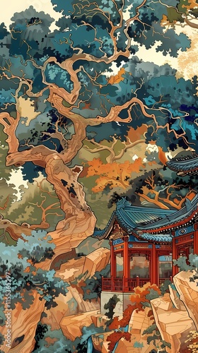 © jinzhen, Fototapeta premium Traditional garden Dunhuang style illustration poster background