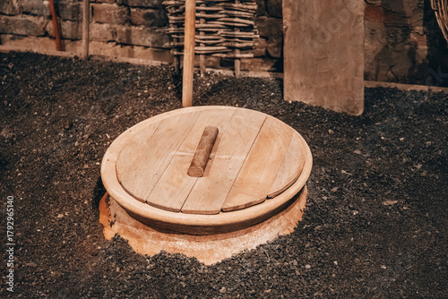 Naklejka premium Traditional Georgian clay wine vessel qvevri buried in the ground and covered with a wooden lid, symbol of ancient winemaking culture