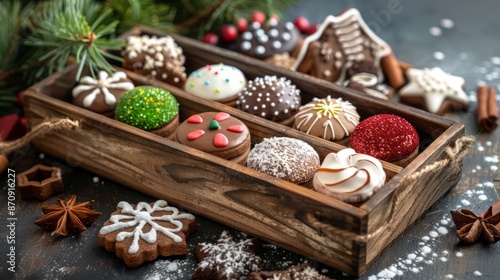 © Otseira, Fototapeta premium Traditional German round glazed Christmas cookies called Lebkuchen and Zimtsterne in a long wooden box. with copy space