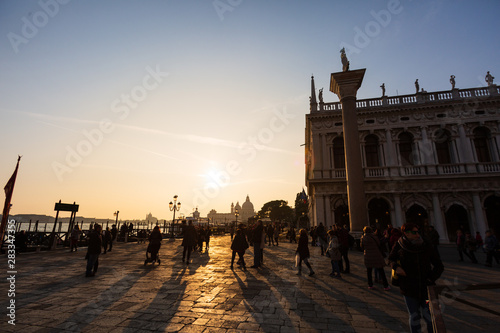 Obraz premium Traditional gondola and The Grand Canal and the Basilica di Santa Maria della Salute in Venice at sunset