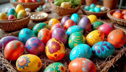 Obraz premium Traditional Hand-Painted Easter Eggs in Basket