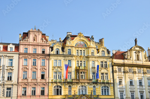 © ppohudka, Fototapeta premium Traditional historical houses with colorful facades on the Old Town Square in beautiful Prague, Czech Republic. Shot in morning golden hour. City center, landmarks. Tourist place.