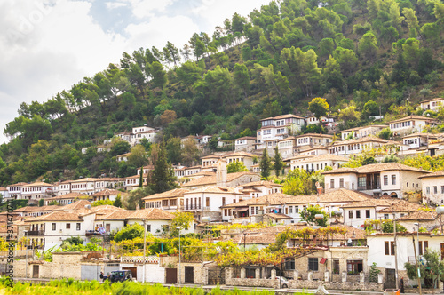 Naklejka premium Traditional houses n Berat old town with trees and locals around. historical places in Albania.
